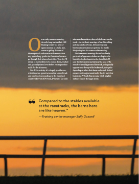 track—the rhythmic marriage of hard breathing and staccato hoof beats. All conversations between their trainers are private, the words dissipating into the vastness of the setting.