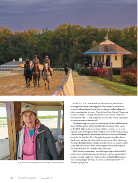 in Fair Hill’s 18 privately owned barns will have run a race at one of six regional tracks. Among them they’ll bring in a total of $677,320, charting 15 wins, seven places and seven shows. Inside the trackside clocker tower located at the finish line, Vicky Battaglini keeps watch, walkie-talkie in hand, surveying the track as hawkishly as a mom at an urban playground. Normally, Battaglini doesn’t actually clock the horses. She mainly watches to see if a horse or rider is down. If that happens, she immediately stops the action and alerts the vets and medics if necessary.