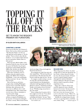 Typically, the carriage dictates the attire. “If you’re in a sporting vehicle, you’d likely wear a fedora,” King continued on page 24