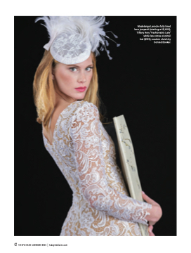 42 STEEPLECHASE LOOKBOOK 2023 | todaymediainc.com Madelange Laroche fully lined lace jumpsuit (starting at $1,600); Tiffany Arey “Fashionably Late” white lace straw cocktail hat ($195); custom clutch by Conrad Booker.