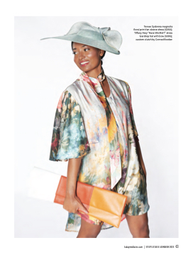 Terese Sydonna magnolia floral print fan-sleeve dress ($350); Tiffany Arey “Have We Met?” straw teardrop hat with bow ($395); custom clutch by Conrad Booker. todaymediainc.com | STEEPLECHASE LOOKBOOK 2023 43