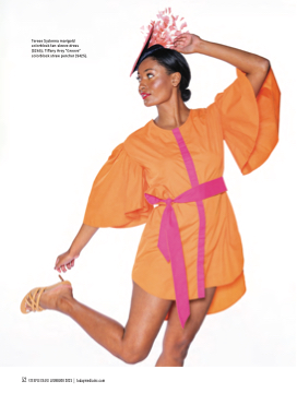 Terese Sydonna marigold colorblock fan-sleeve dress ($265); Tiffany Arey “Groove” colorblock straw percher ($425). 52 STEEPLECHASE LOOKBOOK 2023 | todaymediainc.com