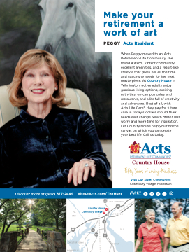 When Peggy moved to an Acts Retirement-Life Community, she found a warm, vibrant community, excellent amenities, and a resort-like lifestyle that gives her all the time and space she needs for her next masterpiece. At Country House in Wilmington, active adults enjoy gracious living options, exciting activities, on-campus cafes and restaurants, and a life full of creativity and adventure. Best of all, with