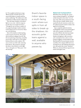 spot a few of Brant’s early American antiques in the home, an icebox isn’t one of them. Stainless steel appliances offer convenience and a contemporary bent, as does a corner banquette hugging a circular farmhouse table. Brant brushed an ivory porch paint across the wood floors. Foot and paw traffic from Lacey, the family’s 8-year-old Chihuahua-Pomeranian mix, adds a patina that screams “farmhouse.” While new, a distressed Persian rug and woven leather stools appear rustic.