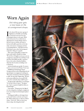 the hunt still saddle up and don red. In that classic environment, vintage gear and tack is a booming business—especially across the Mid-Atlantic states, where fox hunting and competitive riding are so popular.