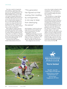 There’s also a market for vintage books, prints and photos, original maps, riding accessories, and “hunting appointments” like flasks and sandwich boxes. A stroll around Maryland Saddlery’s Hockessin store offers