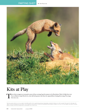 hese feisty youngsters are among the many red foxes coming of age this summer in the Brandywine Valley. It’s likely they were born in March or April. Kits live in a den with both parents, who share the responsibility of raising their young. The average litter size is six.