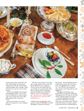 browns, but the home-cooked feel is the same. The pineapple casserole is pure comfort food, a mixture of white bread, crushed pineapple, spices and egg. “It gets a little brown on top for a bit of crunch,” he notes.