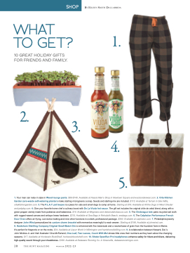 1. Your man can relax in style in Wood lounge pants. $89-$140. Available at Hassis Men’s Shop in Newtown Square and woodunderwear.com. 2. Orta Kitchen Garden zero-waste self-watering planters make starting microgreens a snap. Seeds and starting mix are included. $110. Available at Terrain in Glen Mills, ortakitchengarden.com. 3. The P.L.A.Y. pet teepee is a place for cats and small dogs to camp at home. Starting at $79. Available at All the Dogs in West Chester and petplay.com. 4. Give your favorite home chef a culinary boost with De La Viuda hot sauce. The gift set includes the original chile de arbol blend, along with a green pepper variety made from poblanos and habaneros. $10. Available at Wegmans and delaviudahotsauce.com. 5. The Chebeague tote pairs recycled sail cloth with rugged waxed canvas and antique brass hardware. $215. Available at Sea Bags in Rehoboth Beach, seabags.com. 6. The Calphalon Performance French Door Oven offers air frying, convection baking and nine other functions in a sleek, professional package. $350. Available at calphalon.com. 7. Philadelphia jewelry designer John Wind personalizes his custom charm bracelet with mementos meaningful to each wearer. Starting at $198. Available at johnwind.com.