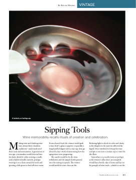 aking wine and drinking wine From a barrel head, the vintner would grab flickering light to check its color and clarity have always been ritualistic a wine thief (a glass or pipette) or possibly a as the dimples in the tastevin reflected the traditions—and rituals need long-handled dipper with a tiny cup, then go liquid. Once satisfied, he’d slurp the wine