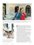 The open gallery-style foyer (with an adjoining cloak room) is perfect for welcoming guests. Wrapped packages are stacked on the stairs, and a mosaic mirrored-glass panther sports a gold bow. Audrey chills the bubbly in a silver tureen that was passed down from her mother.