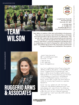Team Wilson is made up of the best and brightest in the business. They strive to succeed as a team while excelling as individuals and creating positive, lasting memories in all relationships. They provide their clients with sound business advice and represent their interests with the highest level of professionalism and integrity. Team Wilson combines unbeatable local expertise with an unwavering commitment to helping their clients achieve their goals. Team Wilson specializes in fine homes and condominiums throughout Delaware and Southeastern Pennsylvania.
