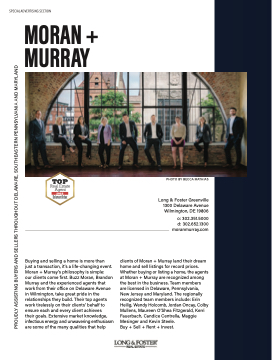 clients of Moran + Murray land their dream home and sell listings for record prices. Whether buying or listing a home, the agents at Moran + Murray are recognized among the best in the business. Team members are licensed in Delaware, Pennsylvania, New Jersey and Maryland. The regionally recognized team members include: Erin Heilig, Wendy Holcomb, Jordan Oncay, Colby Mullens, Maureen O’Shea Fitzgerald, Kerri Fauerbach, Candice Centrella, Maggie Mesinger and Kevin Steele.