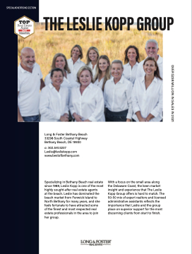 the Delaware Coast, the keen market insight and experience that The Leslie Kopp Group offers is hard to match. The 50-50 mix of expert realtors and licensed administrative assistants reflects the importance that Leslie and the group place on superior support for the most discerning clients from start to finish.
