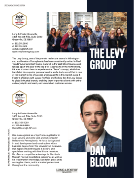 The Levy Group, one of the premier real estate teams in Wilmington and southeastern Pennsylvania, has been consistently ranked in Real Trends’ America’s Best Teams, featured in the Wall Street Journal, and ranked again this year in the top 3 for large teams in the northern DE/ PA area. Contact them to experience the “Team” concept, which has translated into superior personal service and a track record that is one of the highest levels of success among agents in this market. Long & Foster’s affiliation with Luxury Portfolio and Forbes, ties the Levy Group to globally trusted brands, enabling them to provide clients with extra- ordinary depth and reach, and unmatched customer service.