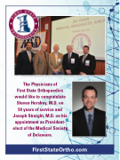 First State Orthopaedics would like to congratulate Steven Hershey, M.D. on 50 years of service and Joseph Straight, M.D. on his appointment as President- elect of the Medical Society of Delaware.