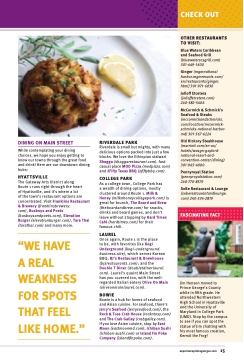 a wealth of dining options, mostly clustered around Route 1. Milk & Honey (milknhoneycollegepark.com) is great for brunch, The Board and Brew (theboardandbrew.com) for snacks, drinks and board games, and don’t leave without stopping by Hard Times Café (hardtimes.com) for their