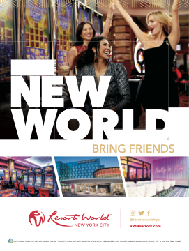IT’S A NEW WORLD BRING FRIENDS @resor t sworldnyc MUST BE 18 YEARS OF AGE OR OLDER TO PLAY THE NEW YORK LOTTERY GAMES. PLEASE PLAY RESPONSIBLY. 24-HOUR PROBLEM GAMING HOTLINE: 1-877-8-HOPENY (846-7369) RWNewYork.com