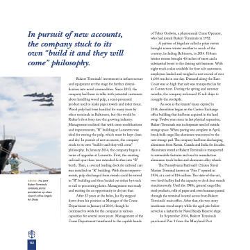 Rukert Terminals’ investment in infrastructure and equipment set the stage for further diversi- fication into novel commodities. Since 2013, the company had been in talks with potential customers about handling wood pulp, a semi-processed product used to make paper towels and toilet tissue. Wood pulp had been handled for many years by other terminals in Baltimore, but this would be Rukert’s first foray into the growing industry. Management realized that with some modifications and improvements, “R” building at Lazaretto was ideal for storing the pulp, which must be kept clean and dry. In pursuit of new accounts, the company stuck to its own “build it and they will come” philosophy. In January 2014, the company began a series of upgrades at Lazaretto. First, the existing railroad spur there was extended further into “B” berth. Then, a covered loading dock for railroad cars was installed on “R” building. With these improve- ments, pulp discharged from vessels could be stored in “R” building and then loaded out either by truck or rail to processing plants. Management was ready and waiting for an opportunity to do just that.
