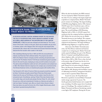 Like many other Rukert Terminals prop- erties, the Point Breeze industrial and business complex has an intriguing past. Rukert Terminals’ newly acquired buildings were part of the Western Electric Company’s sprawling Baltimore plant, where telephone cable, cord and wire were manu- factured from 1929 to 1984. Prior to that, the land at the eastern edge of Canton was the site of an entirely different establishment — an amusement park! Named for its location along the Patapsco River, the Riverview Amusement Park operated from 1898 to 1929. Keeping with the Rukert custom of celebrating local history, management decided to name its latest acquisition Rukert Riverview.