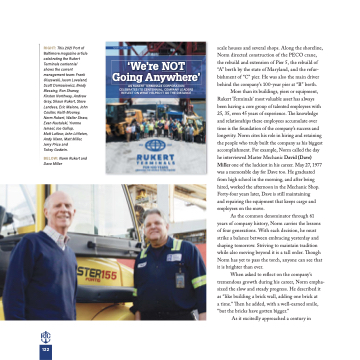 RIGHT:This2021Portof Baltimore magazine article celebrating the Rukert Terminals centennial shows the current management team: Frank Olszewski, Jason Loveland, Scott Damasiewicz, Brody Blessing, Ron Shaney, Kirsten Northway, Andrew Gray, Shaun Rukert, Steve Landess, Eric Malone, John Coulter, Keith Mooney, Norm Rukert, Walter Straw, Evan Nastalski, Yvonne Ismael, Joe Gallup,