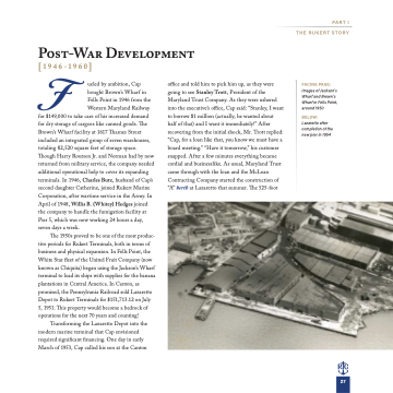 half of that) and I want it immediately!” After recovering from the initial shock, Mr. Trott replied: “Cap, for a loan like that, you know we must have a board meeting.” “Have it tomorrow,” his customer snapped. After a few minutes everything became cordial and businesslike. As usual, Maryland Trust came through with the loan and the McLean Contracting Company started the construction of “A” berth at Lazaretto that summer. The 525-foot