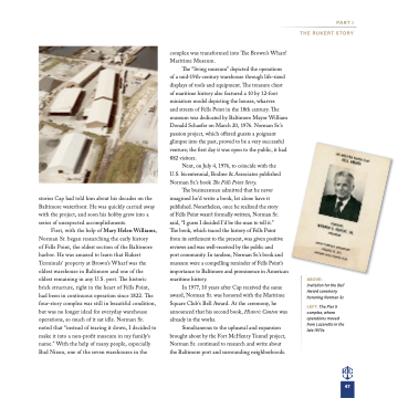 port community. In tandem, Norman Sr.’s book and museum were a compelling reminder of Fells Point’s importance to Baltimore and prominence in American maritime history.