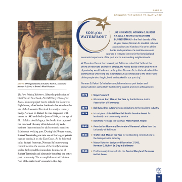 The Port: Pride of Baltimore. After the publication of his fifth and final book, Fort McHenry: Home of the Brave, his next project was to rebuild the Lazaretto Lighthouse, a lost harbor landmark that stood on the site of the Lazaretto Terminal for nearly a century. Sadly, Norman G. Rukert Sr. was diagnosed with cancer in 1983 and died in June of 1984, at the age of 68. He left a double legacy: five books that captured the color and vibrancy of his beloved city and a business that continued to add economic muscle to Baltimore’s working port. During his 53-year tenure, Rukert Terminals grew into one of the largest private marine terminals on the East Coast. As he followed in his father’s footsteps, Norman Sr.’s unwavering commitment to the success of the family business spilled far beyond the immediate boundaries of Rukert Terminals and ultimately benefited the entire port community. The accomplishments of this true “son of the waterfront” resonate to this day.