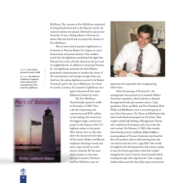 The reconstructed Lazaretto Lighthouse is a testimony to Norman Rukert Sr.’s legacy as a port businessman and preservationist. One resident noted that the lighthouse symbolized the light that Norman Sr.’s series of books shined on the port and its neighborhoods. In addition to honoring Norman Sr., the lighthouse embodies the third Rukert generation’s determination to weather the storm of the tunnel project and emerge stronger than ever. And last, the replica lighthouse proved to be Rukert Terminals’ gift to the city of Baltimore. As it had for nearly a century, the Lazaretto Lighthouse once