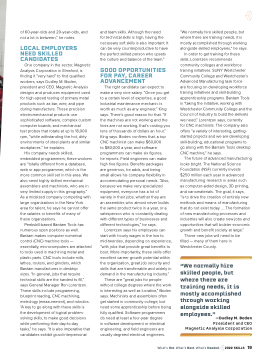 sizes. “In general, jobs that require technical skills are the hardest to fill,” says General Manager Ron Lorentzen. These skills include programming, blueprint reading, CNC machining, metrology (measurement), and robotics. “A key to go along with these skills is the development of logical problem- solving skills, to make good decisions while performing their day-to-day tasks,” he says. “It is also imperative that candidates exhibit good interpersonal