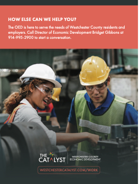 HOW ELSE CAN WE HELP YOU? The OED is here to serve the needs of Westchester County residents and employers. Call Director of Economic Development Bridget Gibbons at 914-995-2900 to start a conversation. WESTCHESTERCATALYST.COM/WORK © Adobe Stock