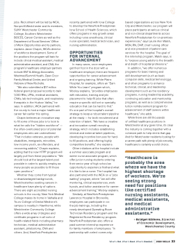 get their foot in the door with a healthcare employer, there are frequent opportunities for career advancement and ongoing training. White Plains Hospital, for example, offers an “Earn While You Learn” program which, Wooley explains, “provides employees with education, training and job placement to help fill jobs that often require a specific skill set or specialty education that can be hard to find.”