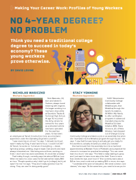 That hobby, though, currently pays him almost $42 an hour. When he earns his union card, the full rate will be nearly $60 an hour. “People question why I didn’t go to [college], but it just wasn’t for me,” he says. “They don’t really question how I’m doing. They can see I’m doing pretty good.”
