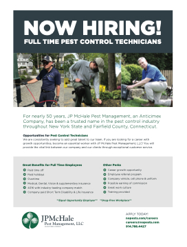We are consistently seeking to add great talent to our team. If you are looking for a career with growth opportunities, become an essential worker with JP McHale Pest Management, LLC! You will provide the vital link between our company and our clients through exceptional customer service.