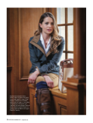 ($599), white snowdrop shirt ($79), honeysuckle pants in camel ($99), Galway country boots in walnut ($449) and navy alpaca socks ($49); all by Dubarry of Ireland. Coach embroidered canvas badge field tote ($525). Ametrine and 14-karat rose gold pendant ($1,300) from Stewart Kingston Jewelers.