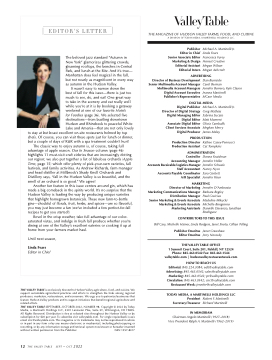 THE VALLEY TABLE SEPTEMBER–OCTOBER 2022, NUMBER 98. Copyright © 2022 by Today Media, a Martinelli Holdings LLC, 3301 Lancaster Pike, Suite 5C, Wilmington, DE 19805. All Rights Reserved. Distribution is free at selected sites throughout the Hudson Valley or by subscription for $20 per year. To subscribe visit valleytable.com. For single copies/back issues email circ@valleytable.com. This magazine or its trademarks may not be reproduced in whole or in part in any form or by any means electronic or mechanical, including photocopying or recording, or by any information storage and retrieval system now known or hereafter invented without written permission from the Publisher. ISSN 1257-8417