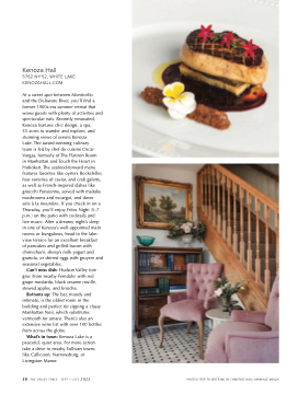in Manhattan and Touch the Heart in Hoboken. The seafood-forward menu features favorites like oysters Rockefeller, four varieties of caviar, and crab galette, as well as French-inspired dishes like gnocchi Parisienne, served with maitake mushrooms and escargot, and dover sole à la meunière. If you check in on a Thursday, you’ll enjoy Frites Night (5–7 p.m.) on the patio with cocktails and live music. After a dreamy night’s sleep in one of Kenoza’s well-appointed main rooms or bungalows, head to the lake- view terrace for an excellent breakfast
