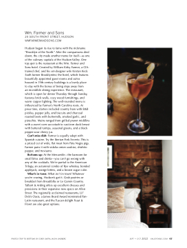 Hudson began its rise to fame with the nickname “Brooklyn of the North.” After the comparisons died down, the city made another name for itself—as one of the culinary capitals of the Hudson Valley. One top spot is the restaurant at the Wm. Farmer and Sons hotel. Created by William Kirby Farmer, a CIA- trained chef, and his set-designer wife Kristan Keck (both former Brooklynites) the hotel, which features beautifully appointed guest rooms and suites