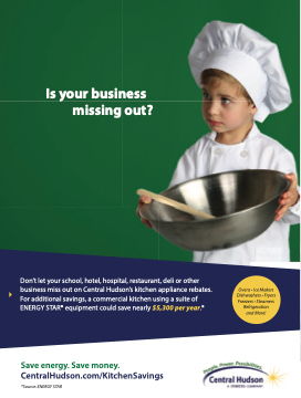 Don’t let your school, hotel, hospital, restaurant, deli or other business miss out on Central Hudson’s kitchen appliance rebates. For additional savings, a commercial kitchen using a suite of ENERGY STAR® equipment could save nearly $5,300 per year.*
