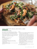 In this savory dish, shrimp are grilled with garlic, spicy red pepper flakes, and red onion, and served with fresh arugula and crunchy garlic croutons. Make sure not to overcook the shrimp; they’re done when they become translucent and have a little char. If you don’t have stale bread, you can fake it by putting slices in a low oven (about 200˚F) and letting them dry out for an hour or so. If you want to, you can make the croutons in advance. They will keep in an airtight container for several days and can be re-crisped in the oven if necessary.