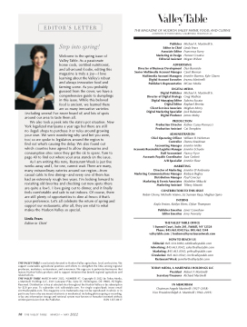 THE VALLEY TABLE MARCH–MAY 2022, NUMBER 97. Copyright © 2022 by Today Media, a Martinelli Holdings LLC, 3301 Lancaster Pike, Suite 5C, Wilmington, DE 19805. All Rights Reserved. Distribution is free at selected sites throughout the Hudson Valley or by subscription for $20 per year. To subscribe visit valleytable.com. For single copies/back issues email circ@valleytable.com. This magazine or its trademarks may not be reproduced in whole or in part in any form or by any means electronic or mechanical, including photocopying or recording, or by any information storage and retrieval system now known or hereafter invented without written permission from the Publisher. ISSN 1257-8417