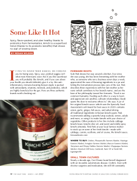 IF YOU’VE NEVER TRIED KIMCHI, WE FORGIVE you for being wary. Spicy, sour, pickled veggies isn’t what most Americans crave. But if you like sauerkraut you will probably like kimchi, and if you care about your health you should definitely give it a try: this anti- inflammatory, immune-boosting Korean staple is packed with antioxidants, vitamins, minerals, and probiotics, which are highly beneficial for the gut. Here are three authentic brands worth checking out.
