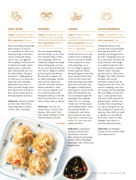 it’s considered one of the Four Heavenly Kings of Cantonese cuisine (along with shumai, char siu bao, and egg tarts). The dumpling is best known for its translucent dough—which appears almost crystal-like— and a delicate pink hue from the shrimp filling. “Har gow” translates to “wedding gown” in Cantonese, as its purse-like shape and color resembles traditional dresses worn in China. Its tender dough, made from wheat starch and tapioca flour, lets the shrimp shine in both presentation and flavor.