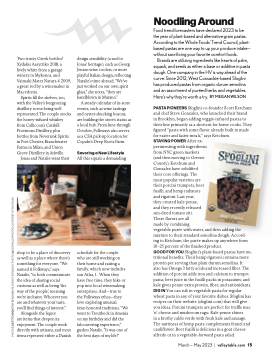 also has Omega 3 fatty acids and increased fiber. The addition of porcini adds iron and calcium to trumpet pasta; beet juice in the fusilli packs in potassium; and kale gives penne extra protein, fiber, and antioxidants. DIG IN You can sub in vegetable pasta for regular wheat pasta in any of your favorite dishes. Sfoglini has recipes on their website (sfoglini.com) that will give you ideas. Porcini trumpets are perfect for truffle mac ‘n’ cheese and mushroom ragu. Kale penne shines