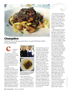 They say that everything about Champêtre, from its size to its pace, feels just right post- pandemic. “With a smaller restaurant, we’re able to work more closely with small farms and purveyors,” explains Patricia. “Michel is cooking the food of his heritage...with products from the Hudson Valley.”