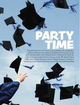 They did it! Now it’s time to honor your graduates with a celebration worthy of all they’ve accomplished. Sprinkling school colors into the décor and serving fun and unfussy food are no brainers, but there are many more ways to inject extra fun into your event. We asked Hudson Valley caterer Agnes Devereux, owner of Agnes Devereux Catering in Staatsburg, to share tips for throwing a memorable fete. BY MICHELLE HAINER