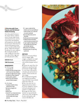 I love this salad! It features the classic Italian combina- tion of creamy white beans and oil-packed tuna, and it's tossed with a dressing that will remind you of your child- hood, but also with radicchio, which will remind you that you’re an adult and like bitter greens. Thinly sliced fennel would also be a nice addition. Macerating the shallot in some vinegar for a few min- utes takes off the edge and provides pleasant acidity.