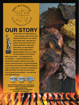 — sweet, tangy, smoky, sharp, with sophisticated flavors. Our unique and original rubs, smoking tech- niques, and sauces dress each meat to perfection. Like many great ideas, our dad Dimitri’s master recipes began with a simple question: how can I make the best barbecue? He started