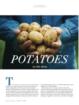 THE POTATO IS OFTEN CHARACTERIZED AS humble, but in truth the tuber fueled the rise of empires and literally changed the world. Born in the Andes Mountains between Peru and Bolivia over 8,000 years ago, potatoes were the main ingredient in the Incan diet—especially when freeze- dried into chuño, which keeps unrefrigerated for years with its nutritional properties intact. Chuño sustained Incan armies and villagers alike, providing the sustenance needed to build one