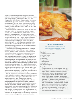 Today, there are over 4,000 varieties around the globe, and many grow well in the Hudson Valley. Jean Paul Stewart- Courtens, who runs Philia Farm in Johnstown, has extensive experience growing potatoes. His personal favorites—all developed by Cornell University—are Keuka Gold, Red Maria, Eva, and Salem. Keuka Gold, Cornell’s take on Yukon Gold (which are native to Ontario), was bred to handle drastic temperature swings, short growing seasons, and uneven rainfall. Red Maria is a good all-purpose potato that retains moisture when baked and holds its shape for potato salad. While white varieties Salem and Eva are both good mashers, Eva is superior for frying.